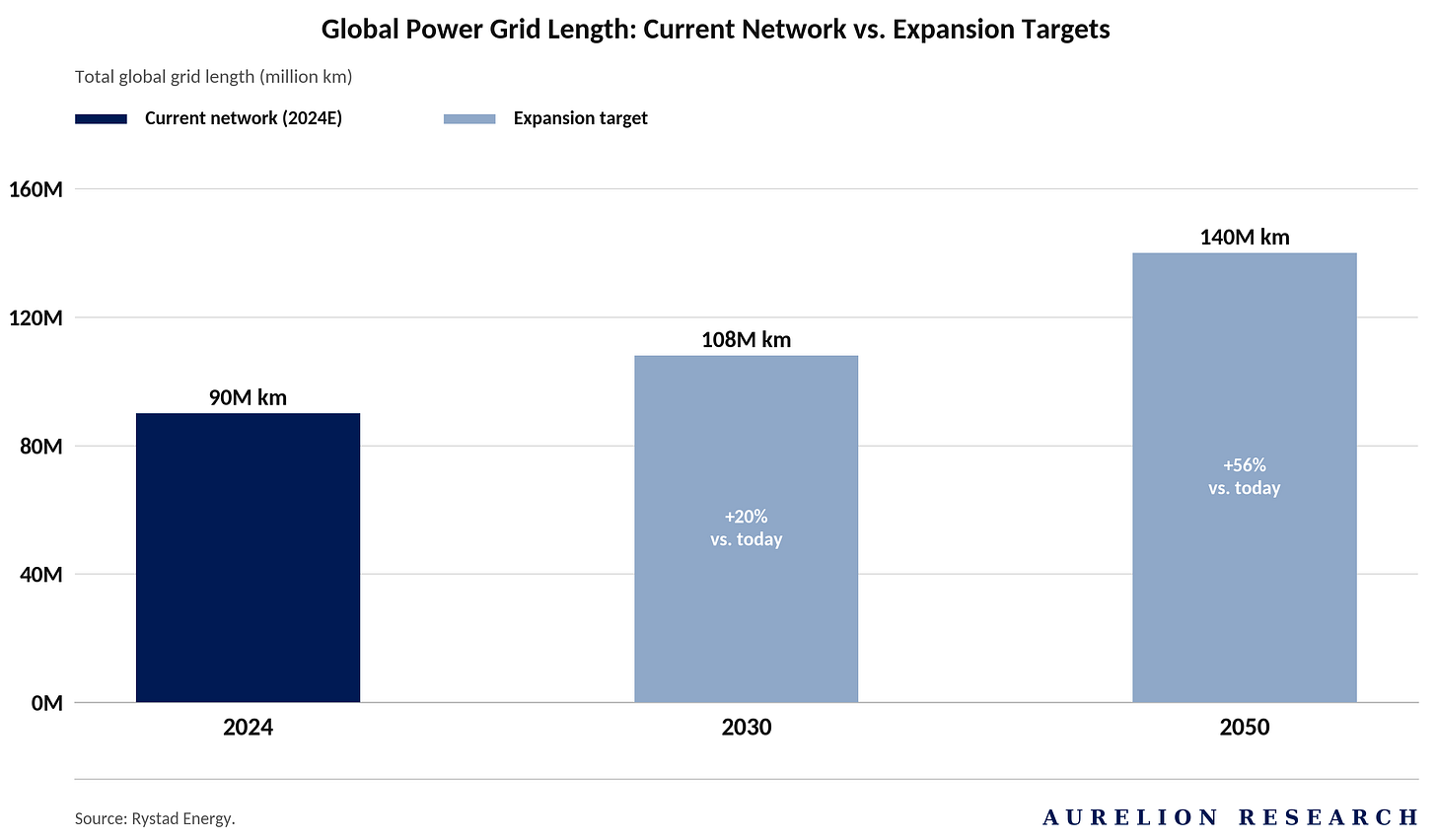 That would represent an increase of about 20% from current levels. Looking further out, total global grid length could approach 140M km by 2050, which suggests the build-out still has a long runway ahead.