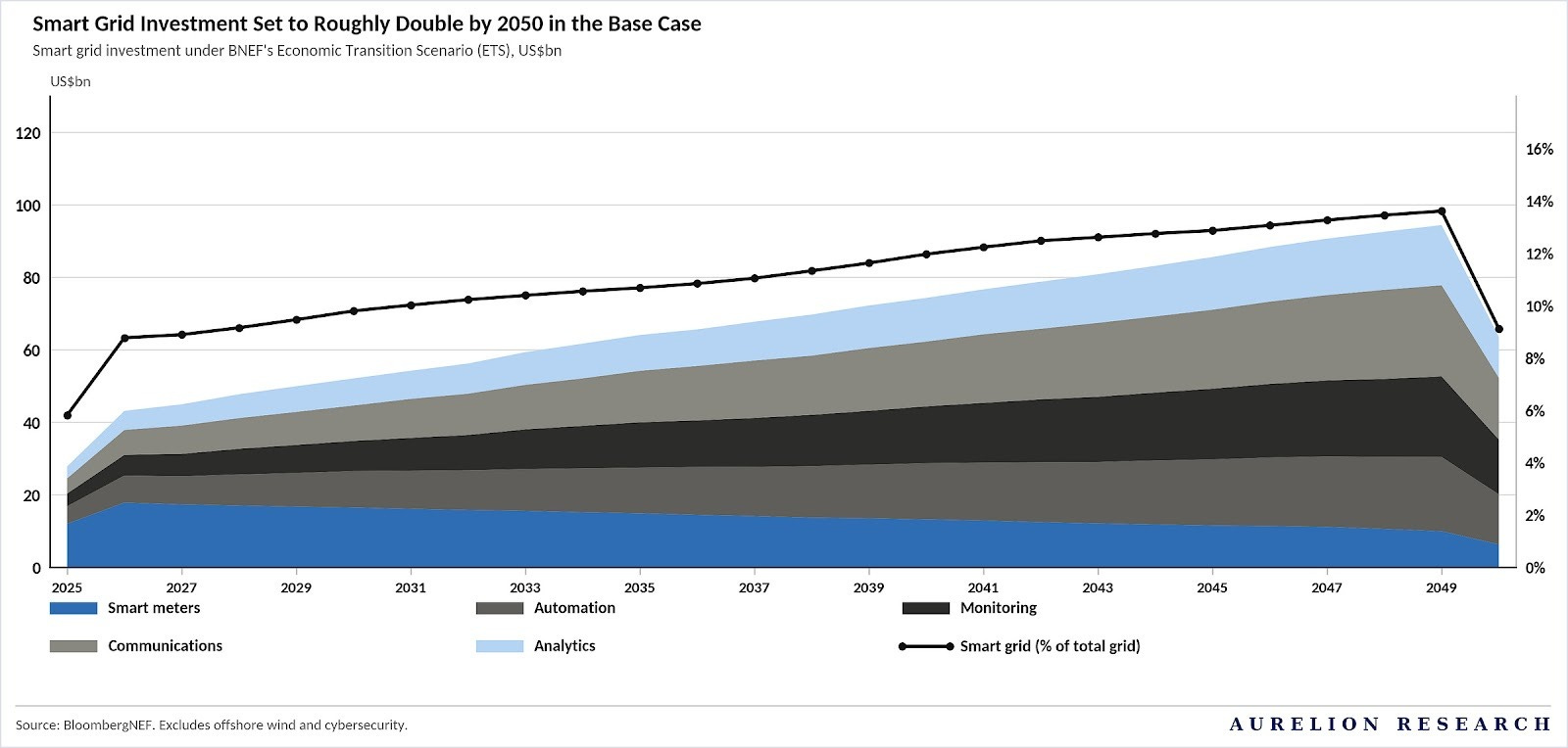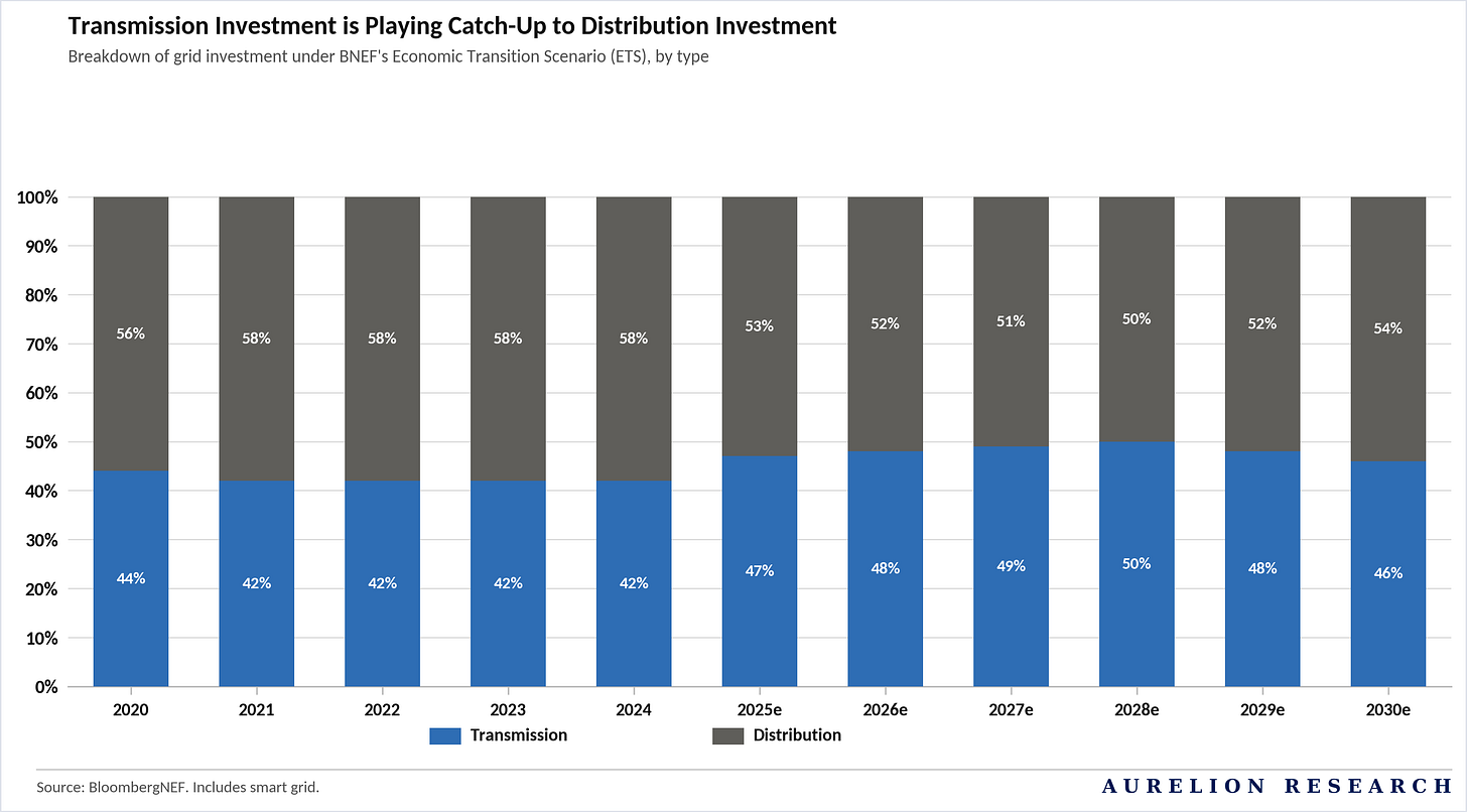 The mix of that spending is changing as well. Distribution still accounts for the larger share today, though transmission is gaining ground as utilities need more long-distance capacity to connect new sources of power and move electricity across wider areas. The data shows transmission rising from ~42% of total grid investment in 2024 to ~50% by 2028, before easing modestly to ~46% in 2030. Even so, the direction still points to a system that will require more backbone capacity alongside reinforcement at the local level.
