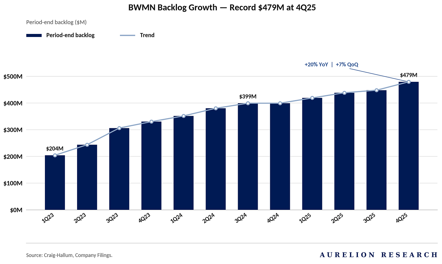 Backlog adds another layer. When a smaller company is tied to a large secular theme, the market needs proof that demand is already translating into booked work and not simply coming from a favorable macro backdrop. Bowman has that proof.