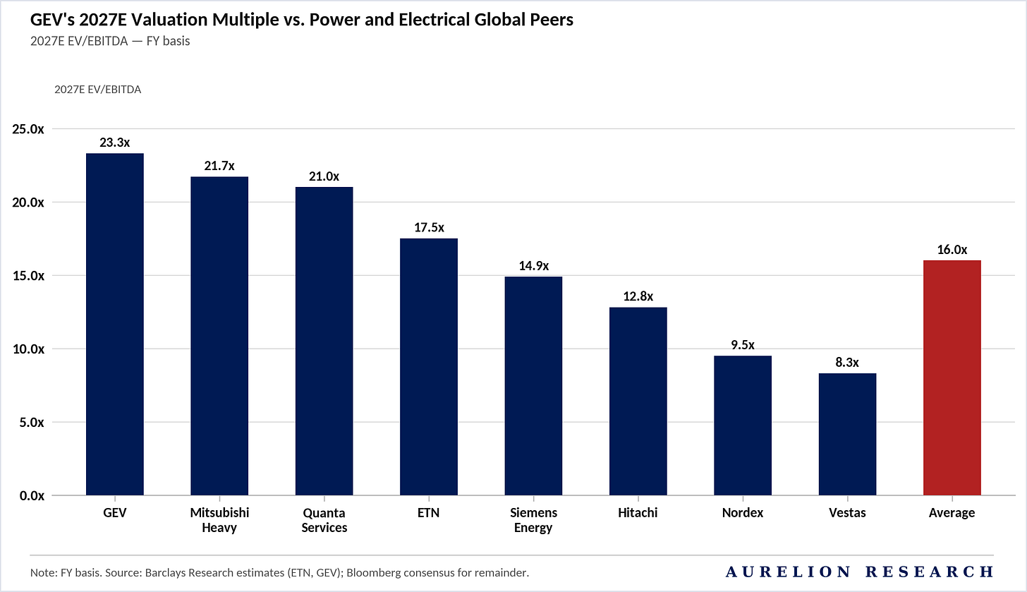 GEV is not cheap, which explains why it is not our favorite name in the space. The stock already trades at a premium to the peer group average, and that is why the upside from here is closer to 17% than something more substantial.