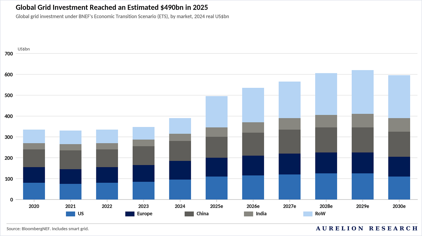 The spending outlook already reflects that shift. Global grid investment is estimated to have reached ~$490Bn in 2025, up from ~$390Bn in 2024, and BloombergNEF’s outlook points to spending approaching $600Bn by 2030. That goes well beyond routine upgrades. It points to a broader wave of capital deployment that is likely to extend through the rest of the decade.
