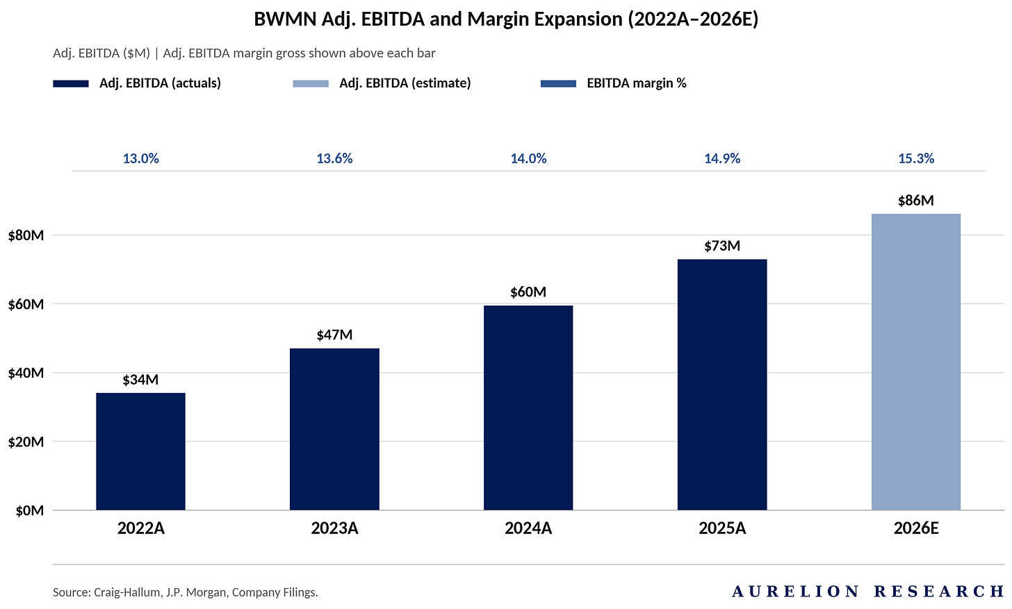 BWMN Adjusted EBITDA has grown from $34M in 2022 to $73M in 2025, with 2026 estimates pointing to $86M. Margin has expanded steadily alongside that, from 13.0% in 2022 to 14.9% in 2025, with further improvement expected in 2026. That progression shows revenue growth is feeding into a stronger earnings profile as the mix shifts toward segments with better unit economics. Revenue growth draws attention first.