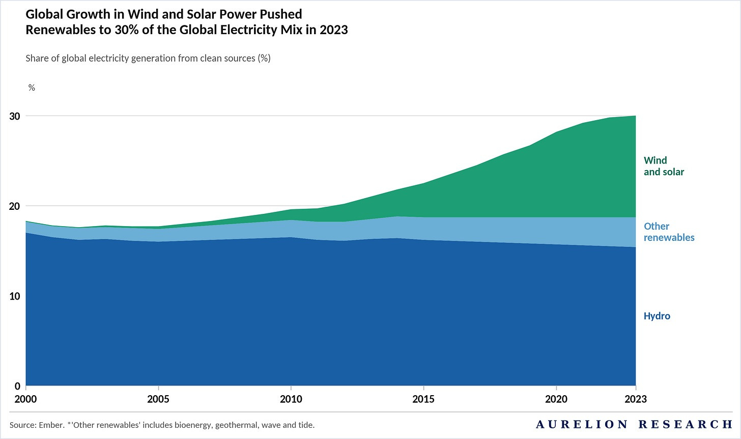 Now that we have covered the challenges on the demand side, it is time to shift focus to the generation side. Over the past few decades, renewable energy has taken a much larger share of global electricity generation. Renewables accounted for roughly 30% of global power generation in 2023, and that share is expected to keep rising in the years ahead.
