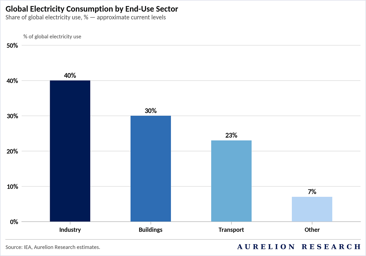 The chart below is a good place to start. Global power use is already enormous, and the demand base is broad. Industry remains the largest end market, buildings still account for a large share, and transport is becoming a more important source of load as electrification moves forward.