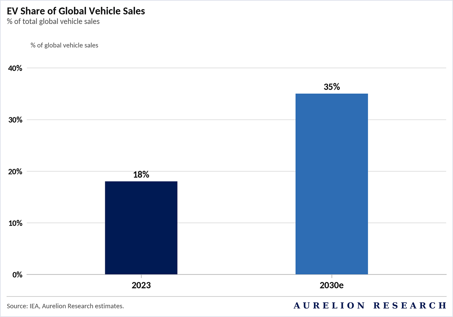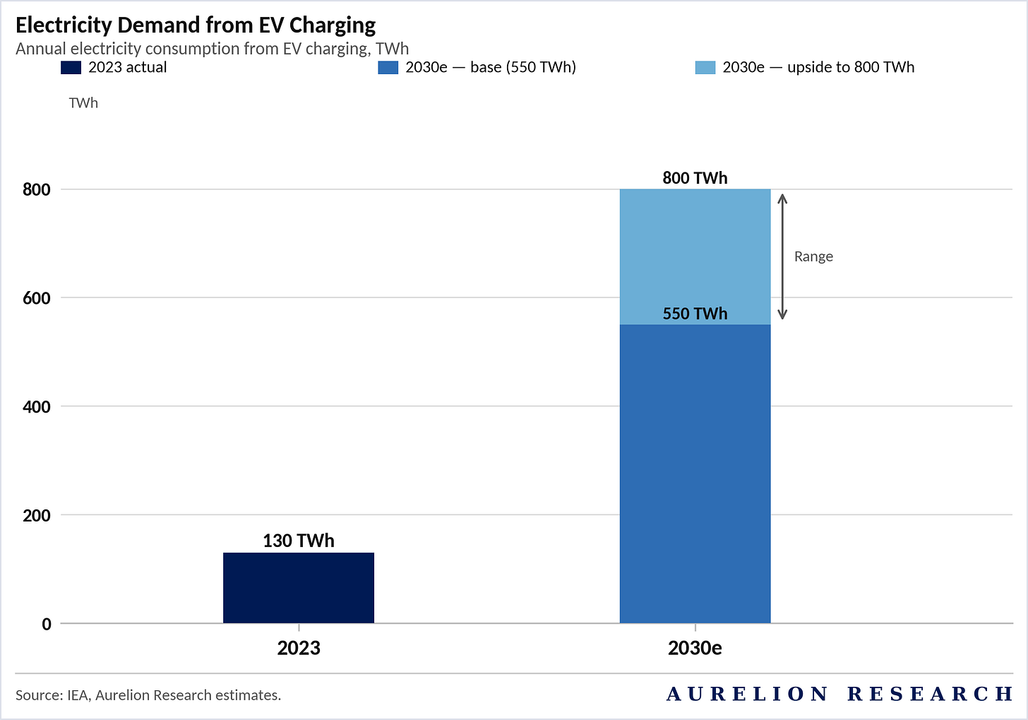 Transport adds another source of growth. Electric vehicles still represent a small share of the global fleet, but adoption is advancing quickly enough to create a meaningful new source of load for the power system.