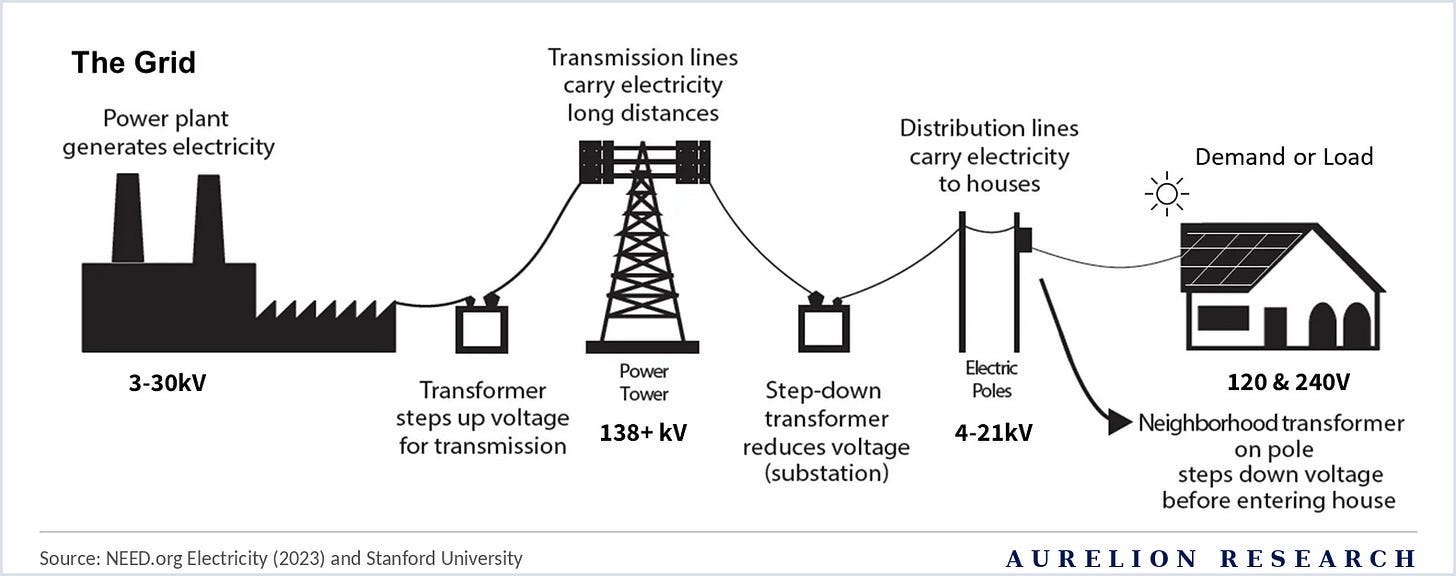 Power plants generate electricity, which is then transported through high-voltage transmission networks. Closer to the point of use, that power moves through lower-voltage distribution networks, which deliver electricity to homes, factories, data centers, and the rest of the economy.