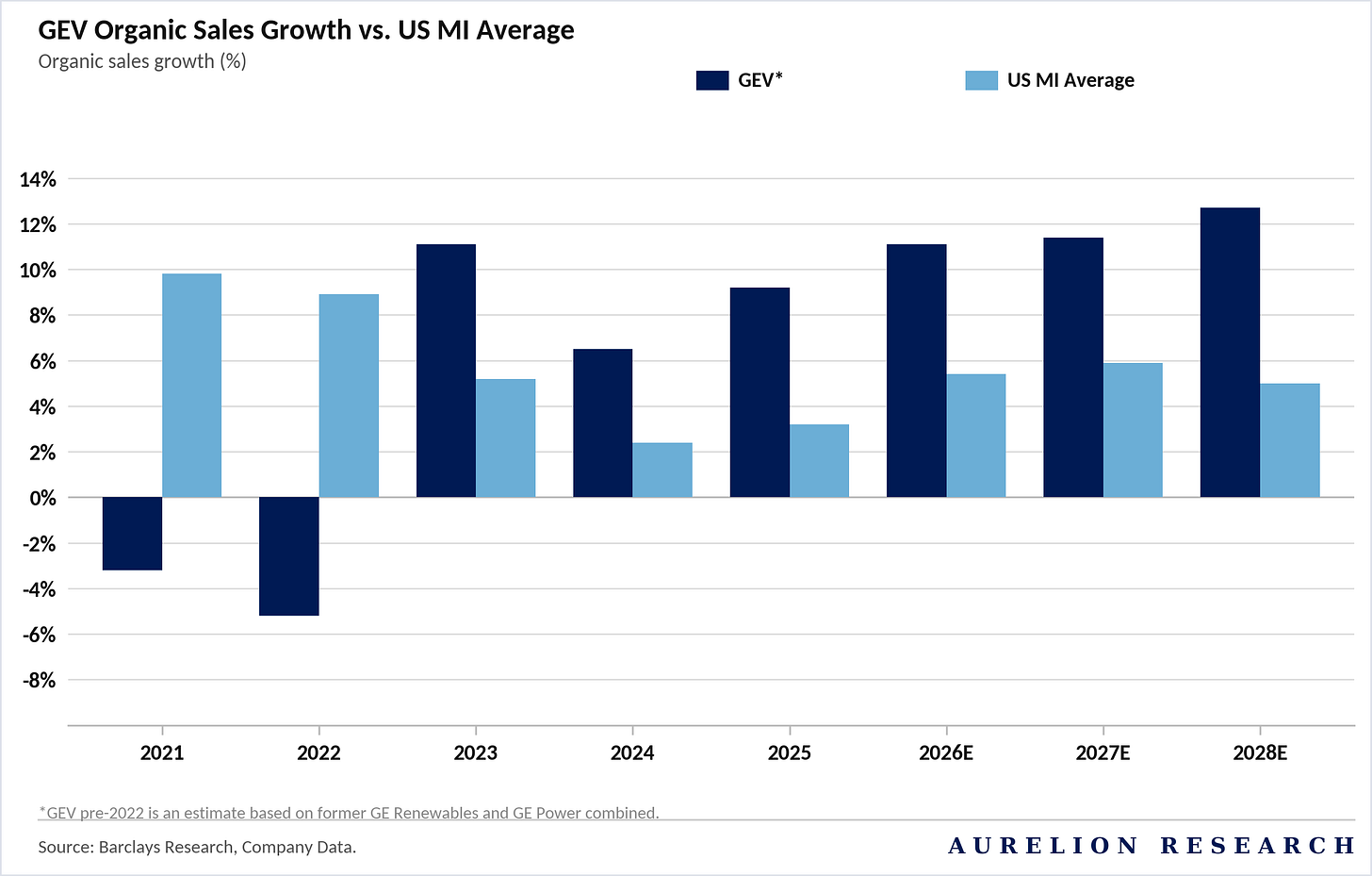The broader setup also looks attractive. After a difficult period earlier in the decade, growth has inflected sharply. As the chart below shows, organic sales growth has moved ahead of the U.S. multi-industry average and is expected to stay there through 2028. That acceleration reflects improving demand across power and electrification, better execution, and a healthier order backdrop. It also supports the view that GEV is entering a period where stronger revenue growth can feed into much better earnings and cash generation.