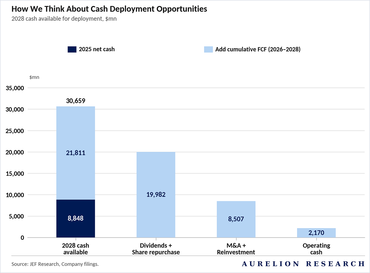 That cash generation opens another part of the upside. By 2028, the company could have a very large amount of cash available for deployment.